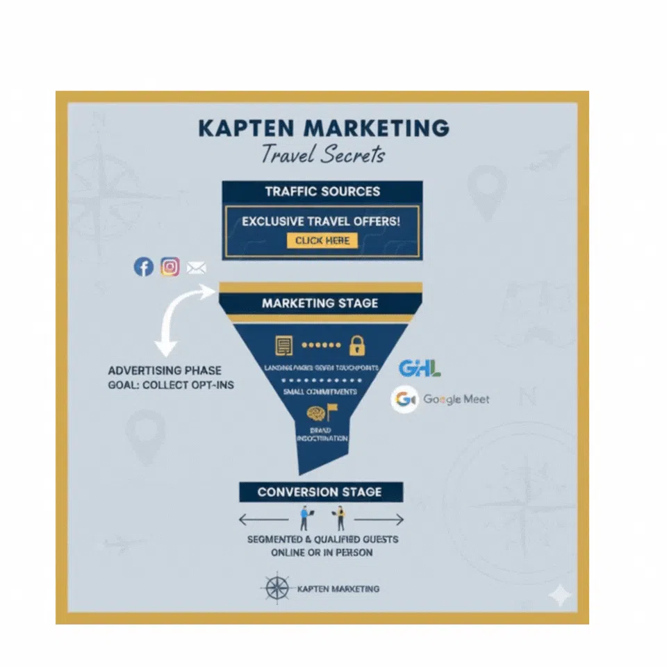 At Kapten Marketing, we specialize in bridging technology with the human desire to travel delivering consistent, qualified tour flow for resorts, travel clubs, and developers. Our systems blend AI automation, digital advertising, and data-driven targeting to fill your preview centers and virtual presentations with motivated, pre-qualified families who are genuinely ready to explore ownership opportunities.